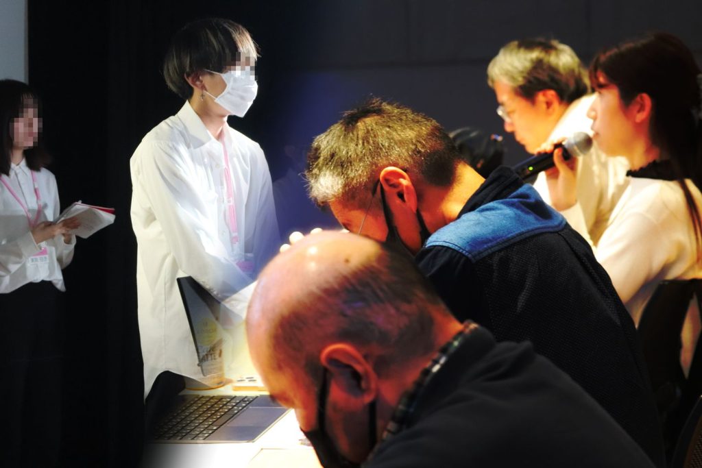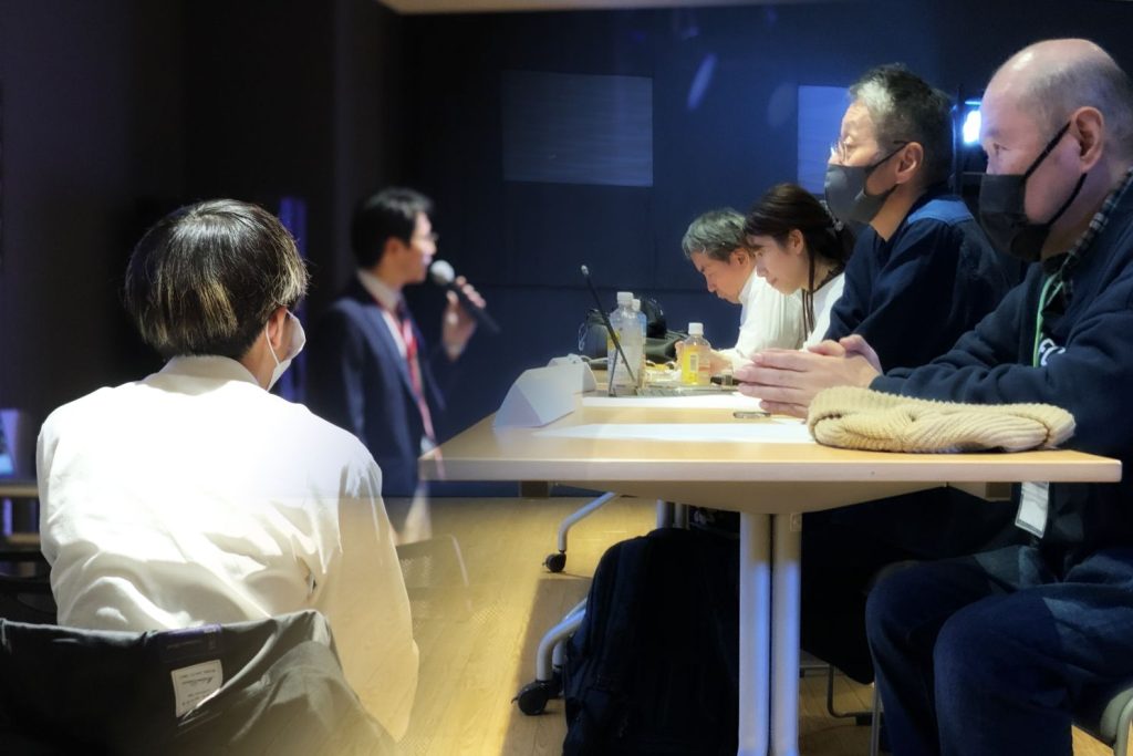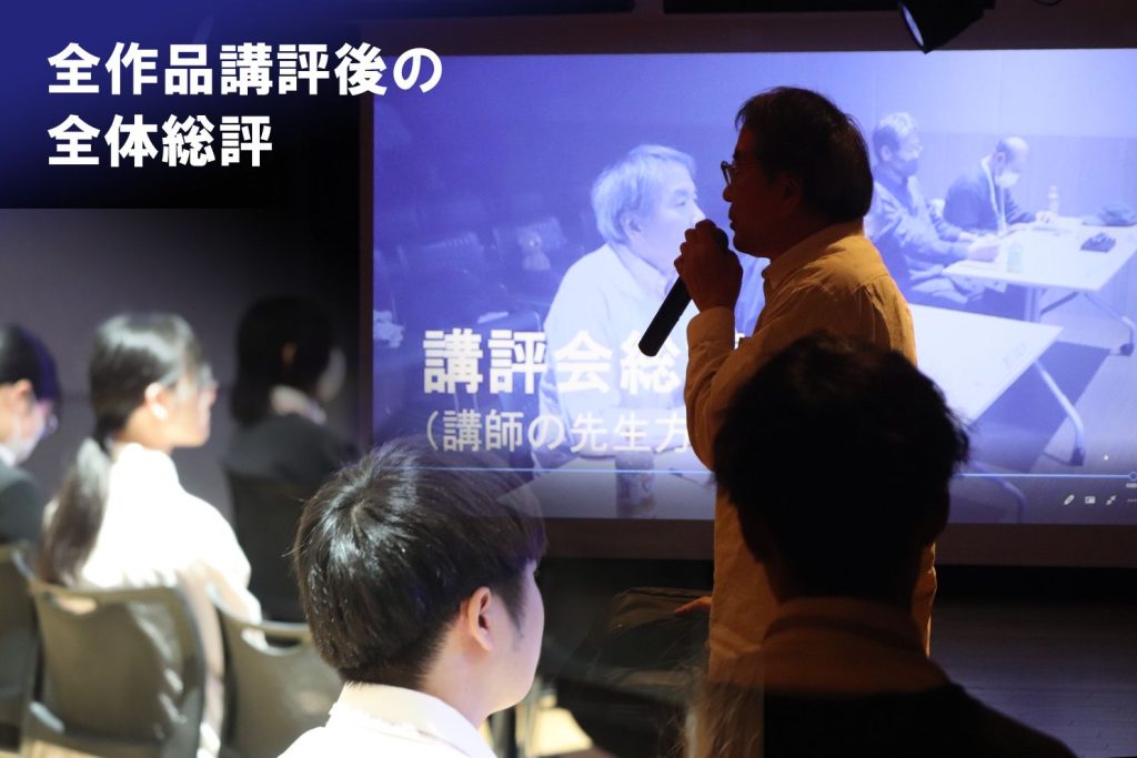 チームごとにチームメンバー紹介、作品の概要を説明した後、実際の作品を上映して講師の先生方に一人ずつ講評をいただきます。
